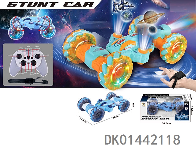 11通扭变特技车,前进、后退、左转圈、右转圈,扭变特技、灯光,音乐、一键喷雾,双投影,加配手表遥控