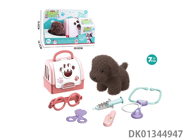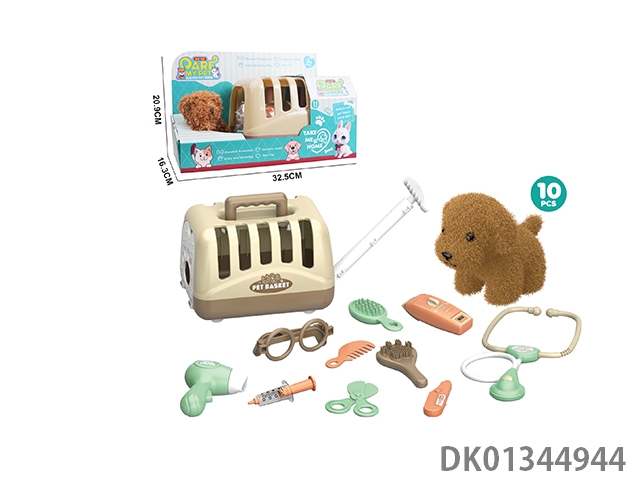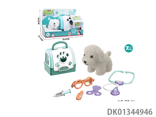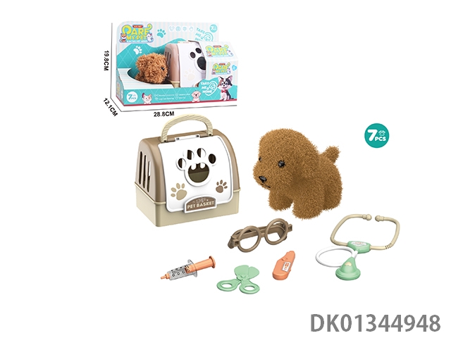 毛绒玩具宠物狗配理发套装+医具套装+拖拉手提狗笼 (2合1)