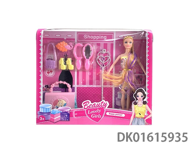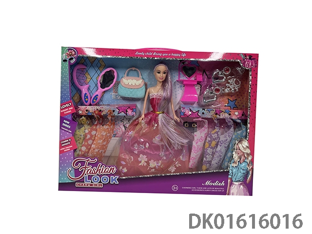 11.5寸实身长马尾晚装芭比娃娃女孩配服装+梳子+镜子+时尚手提包+梳妆台+耳环+项链+皇冠(时尚芭比公主娃娃)