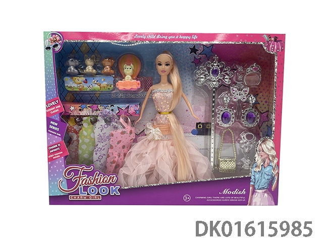 11.5寸实身长马尾晚礼服时尚芭比娃娃配宠物狗加手杖首饰整套 11.5寸芭比公主娃娃换装芭比套装长发公主芭比饰品
