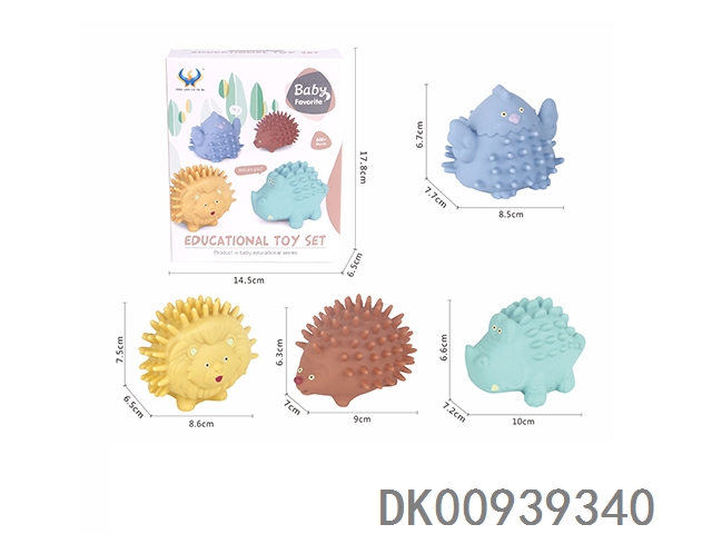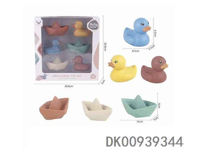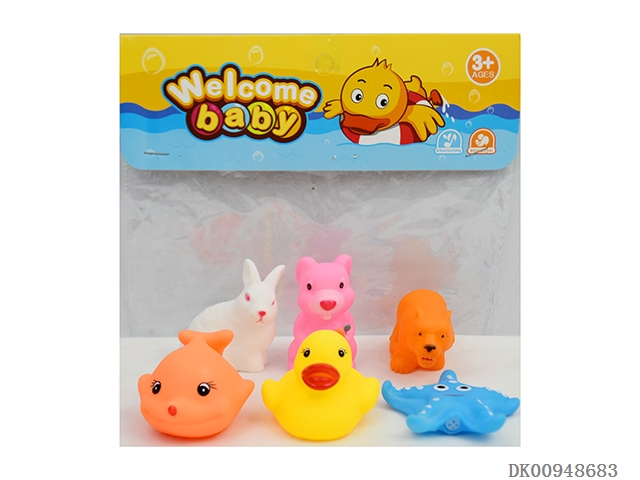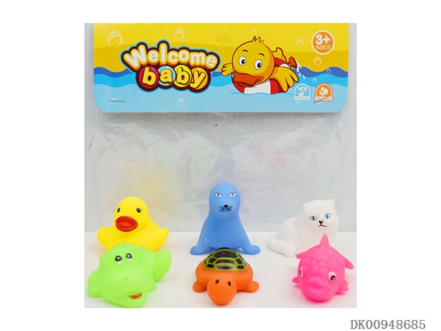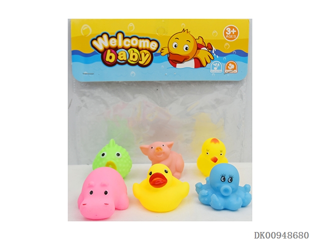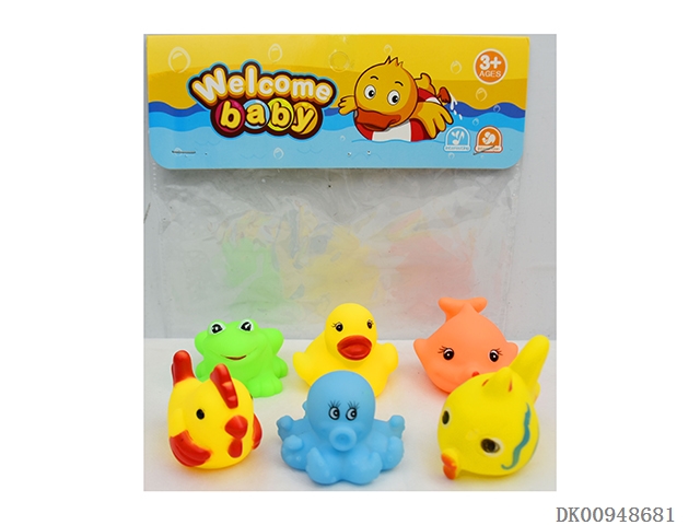 Yellow duckling, orange dolphin, yellow spot fish, frog, rooster, blue eight claw