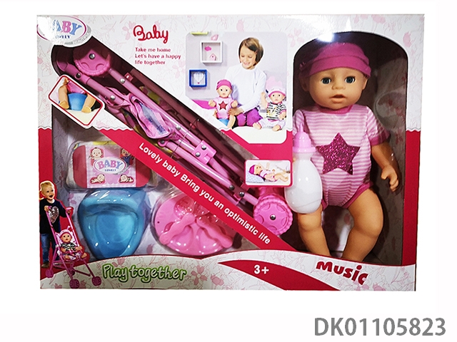 New 16 inch water and urine enamel baby with cart, toilet, dinner plate, urine pants, 6-tone ic