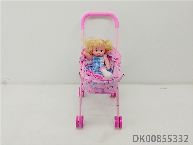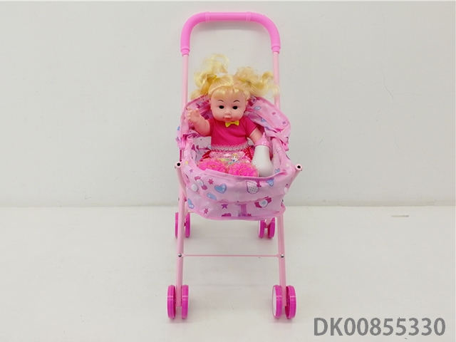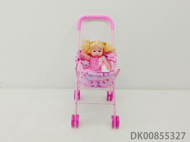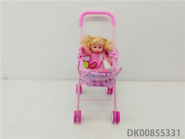 Iron trolley with all enamel doll and bottle and comb and mirror