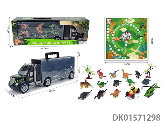 Handheld gift box sliding container truck with 12 dinosaurs, 1 airplane, 1 sliding beach motorcycle, 2 trees, and 1 map