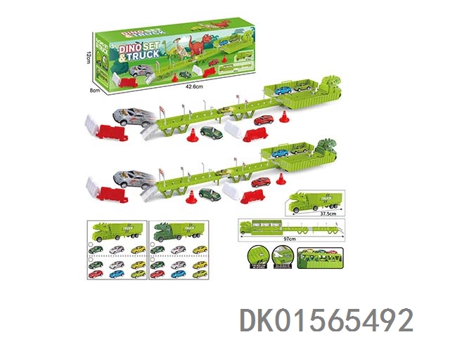 Dinosaur container truck parking scene (equipped with 3 metal powered trucks, 15 road signs and barriers, and 1 diy sticker)