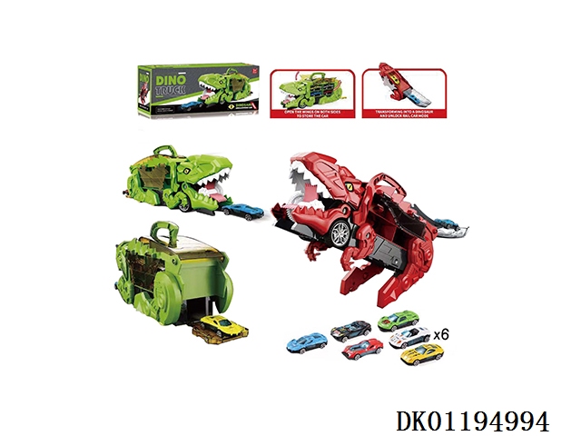 New portable and deformable swallowing alloy car dinosaur track storage car (equipped with 6 sliding alloy cars) green/red 2-color mixed