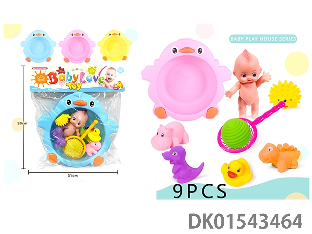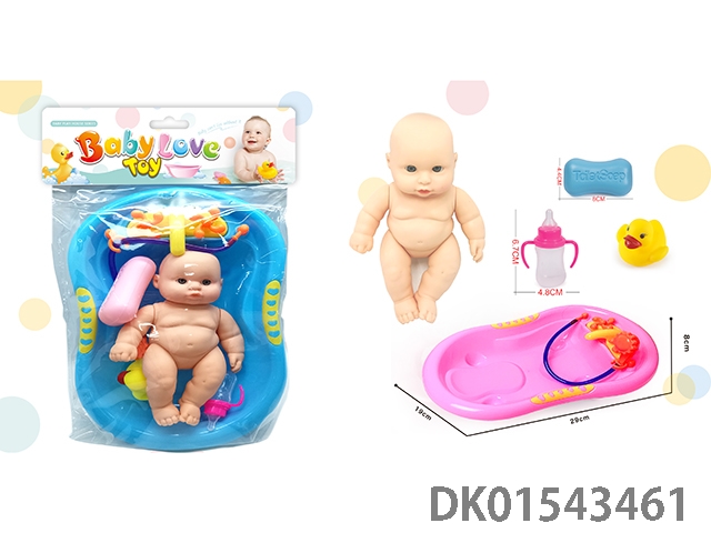 Vinyl doll bath toy (bath, large doll, soap, bottle, vinyl duck)