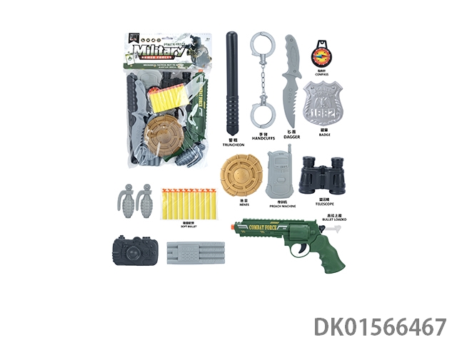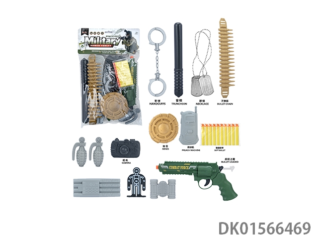 Military kit (handcuffs and bombs, compass and grenades * 2, badge and camera * 2, gold bullets * 2, hang tags and timed bombs, bullet clips and binoculars, and revolver soft ammunition gun)