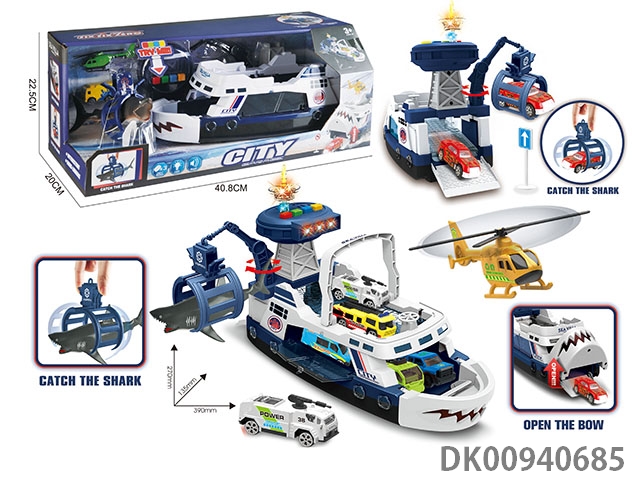 Light and music ejection shark city storage ship (equipped with 1 alloy aircraft, 1 alloy car and 1 lighthouse) (3 ag13 button batteries)