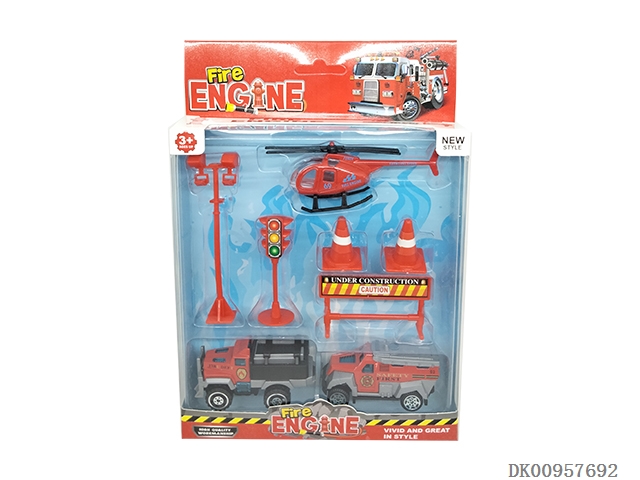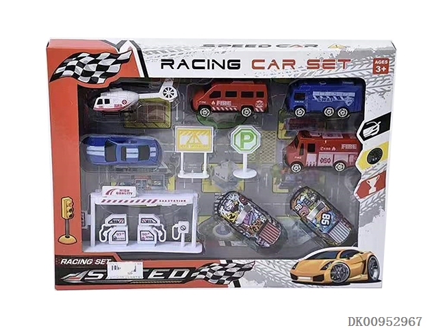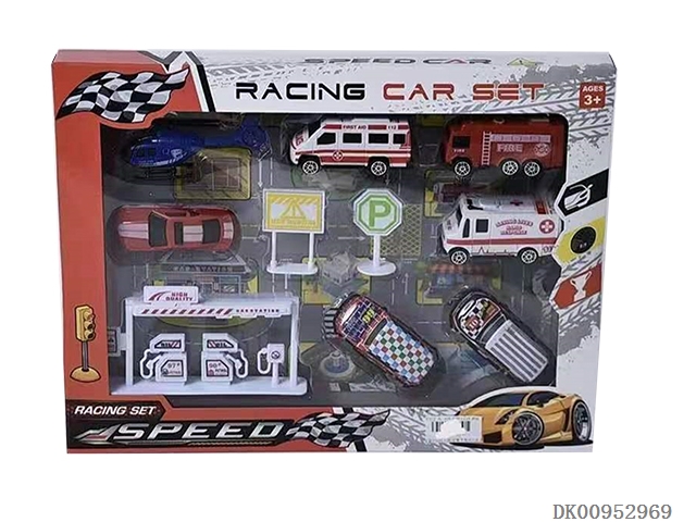 2 Huili tin racing cars with 4 solid color taxis and 1 solid color helicopter road sign gas station