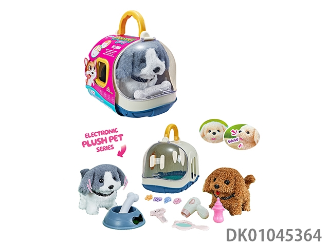 Electric plush and small dog and dog cage and 4 hair clips and bottle and hair dryer and mirror and comb and dog bowl and bone