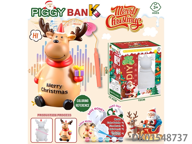 Christmas reindeer lights, music, hand-held lanterns, piggy bank