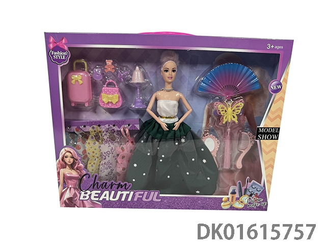 9关节11.5寸实身戴项链晚装芭比娃娃女孩配服装+行李箱+戒指+手提包+扇子+发夹+梳子+镜子(时尚芭比公主娃娃)