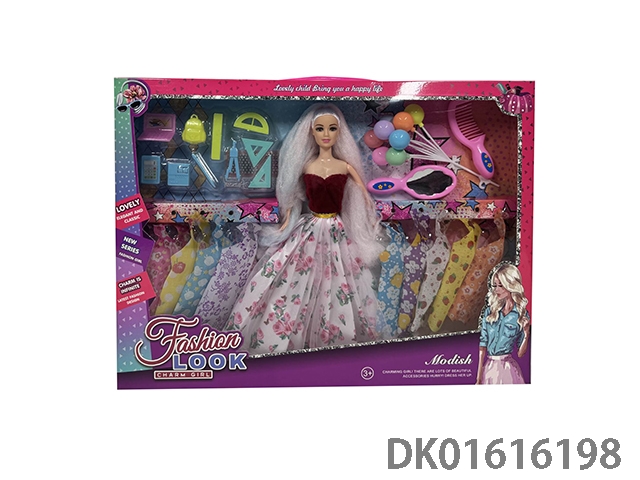 11.5寸实身时尚头发长马尾时尚芭比娃娃女孩配服装+学习用品套装+气球+梳子+镜子(时尚芭比公主娃娃)