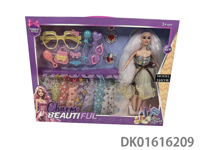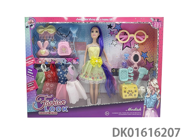 大腿11.5寸实身时尚头发长马尾时尚芭比娃娃女孩配服装+眼镜+梳子+手提包+发夹+气球+耳环(时尚芭比公主娃娃)