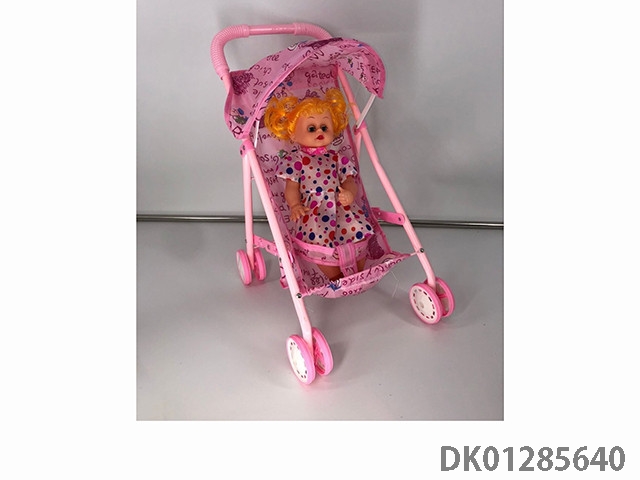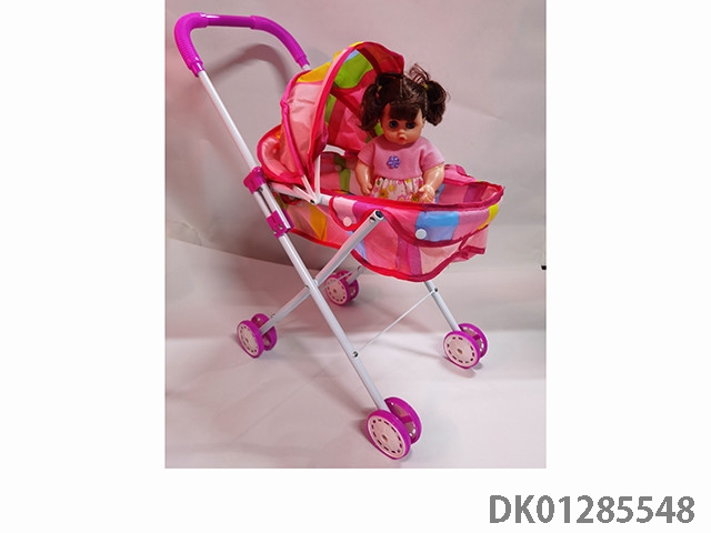 白管红色花纹铁制玩具推车配娃娃