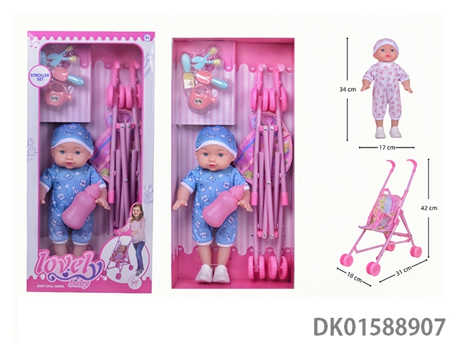 14寸直脚空身仿真3D眼娃娃配养花吸塑推车套装(带4声IC)