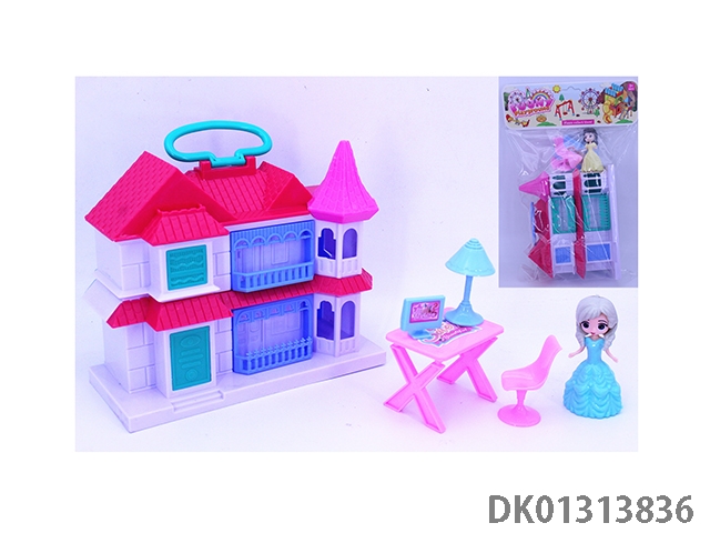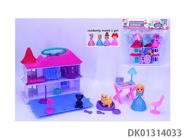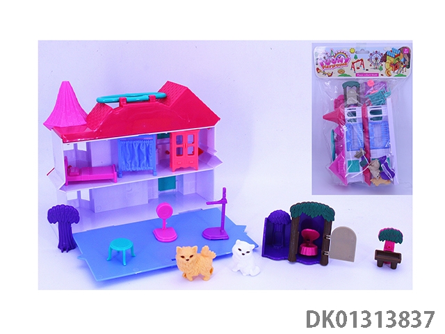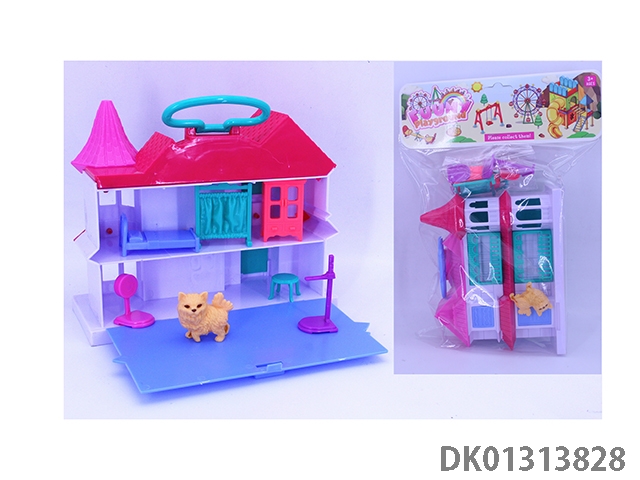 女孩手提翻盖别墅套装(猫狗电脑桌家具)