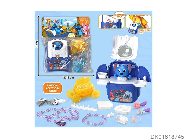 Stitch playing house with a one shoulder backpack and necklace