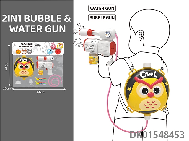 2-Layer water gun and owl backpack 1.5l, 2-in-1 electric bubble gun and water gun