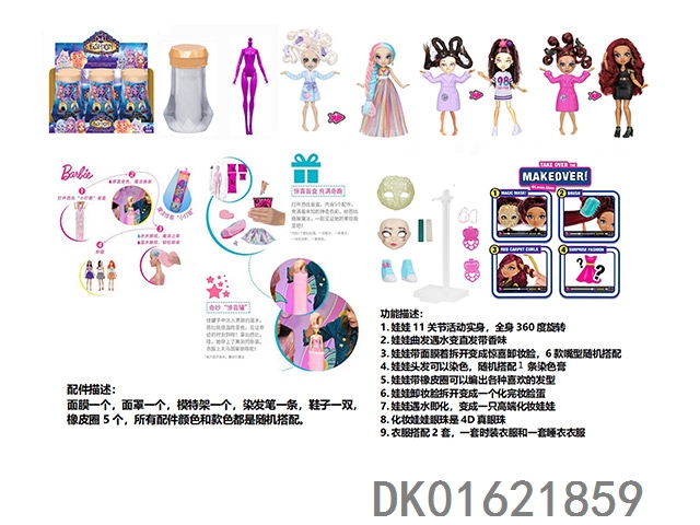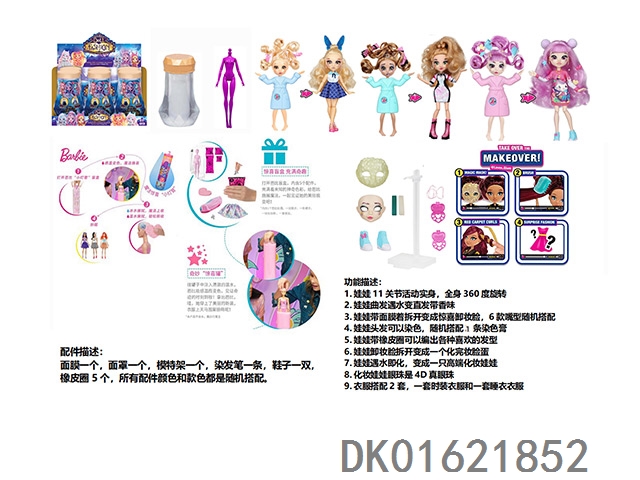 Water soluble color changing series fail.fix. 9-inch 11 joint solid 3d real eye change face makeup barbie hair strap with 6 different surprise accessories. one piece of fashionable clothing, 3 styles mixed, 6pcs/box
