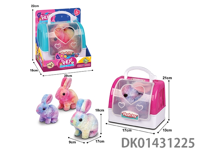 Three hybrid electric plush rabbits and a 2-color handheld cage