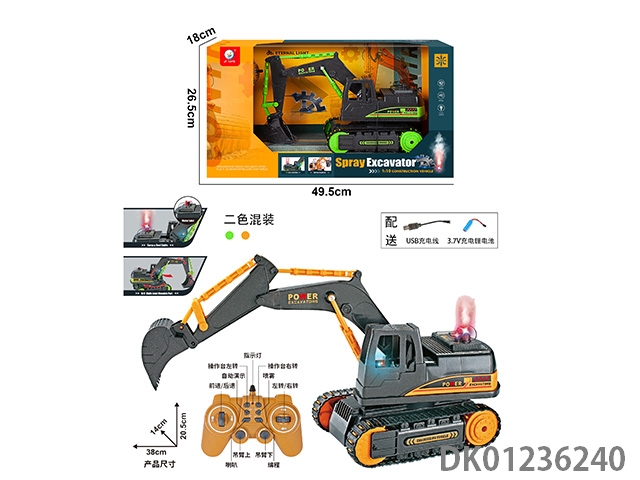 Spray light digging truck, black room green/black room yellow two color mixed packaging, 1:10 (package) body 3.7v rechargeable lithium battery, usb cable, water bottle, remote control (2aa not included) 12 way