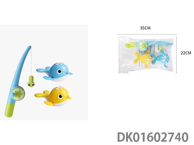 Frog net fishing with fishing rod and 2 fish (light blue and yellow, magnetic)