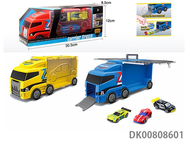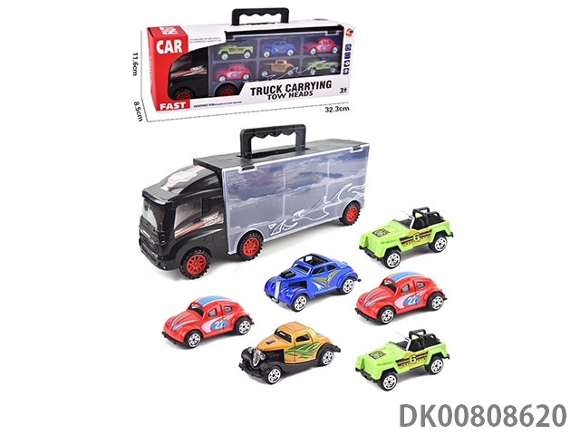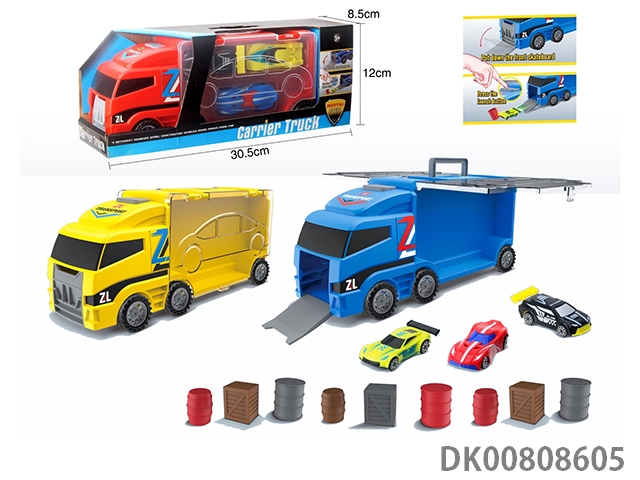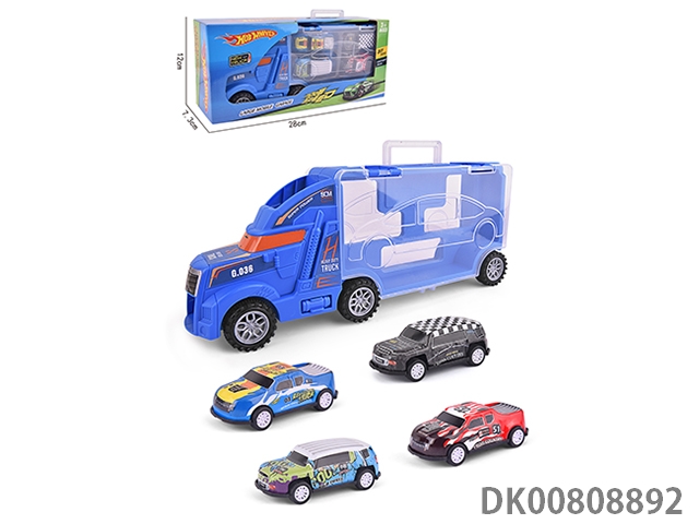 Portable gift box container sliding tractor with 4 return iron racing cars