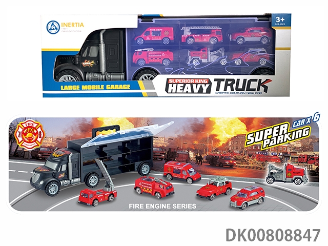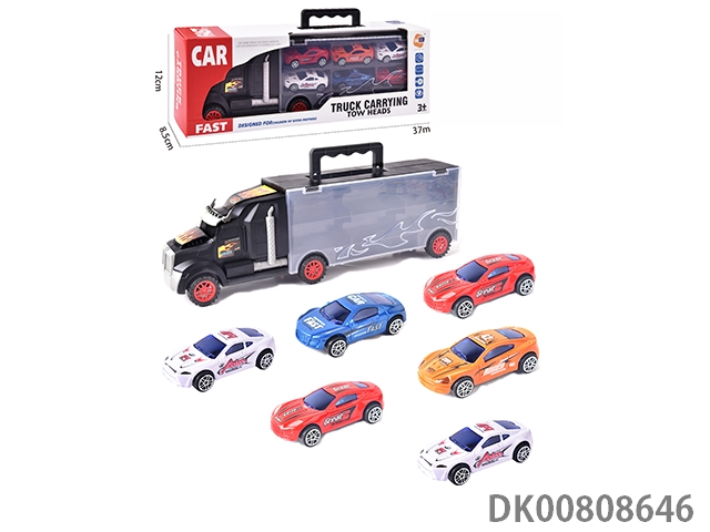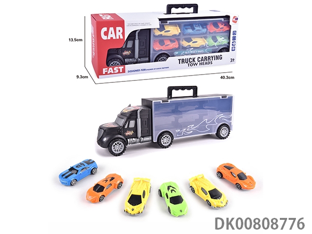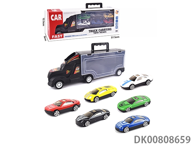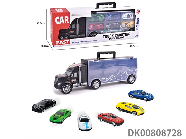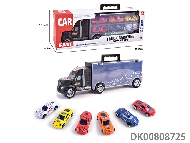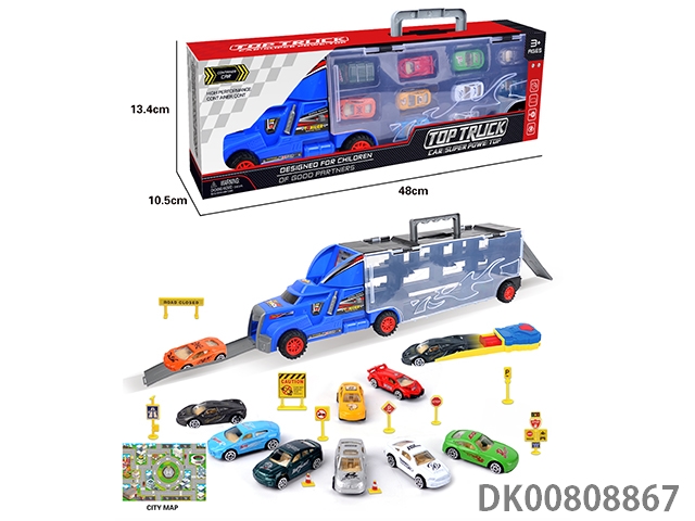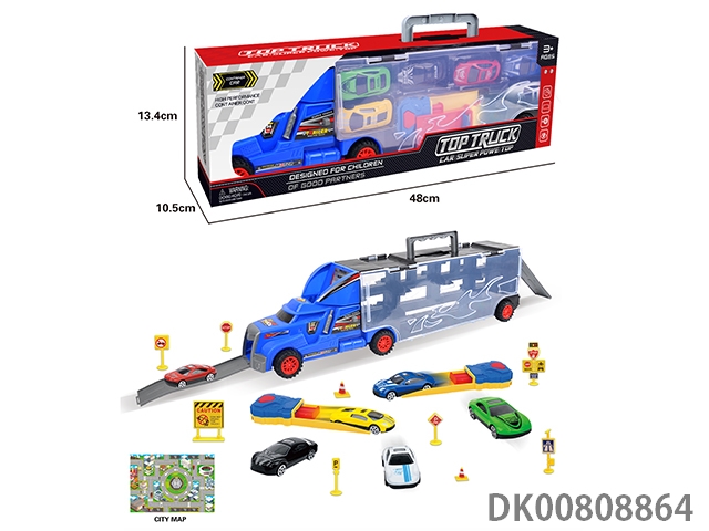 Portable gift box container trailer with 10 small alloy cars, 10 road signs, 2 skateboards, 1 catapult and 1 map