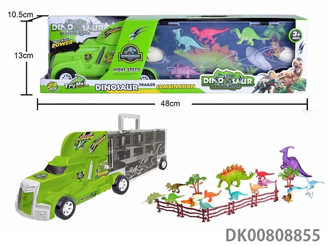 Hand held gift box container sliding tractor with 12 solid small dinosaurs and 2 trees and 2 dinosaur eggs and 1 solid big dinosaur and fence