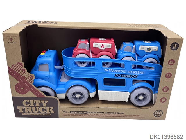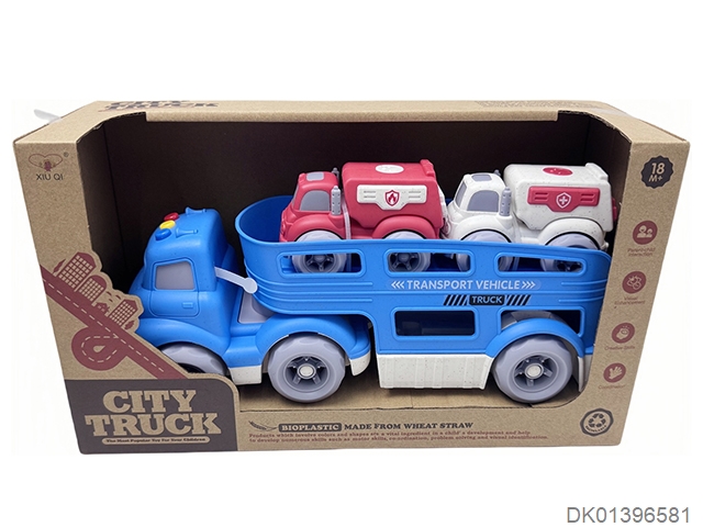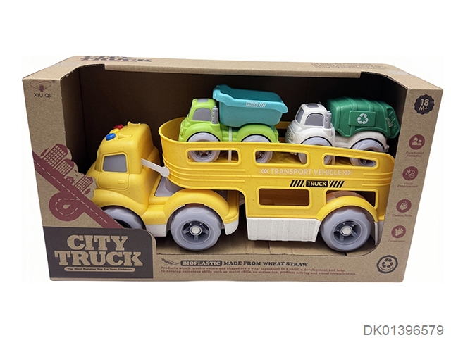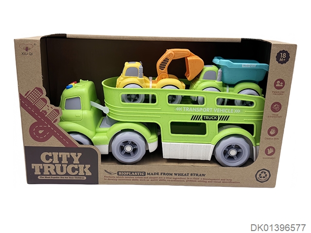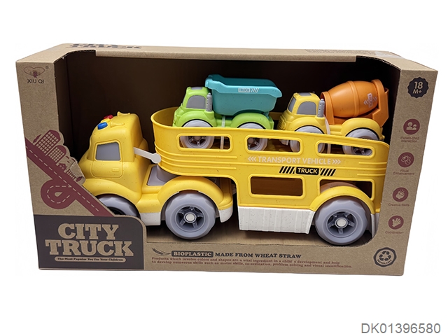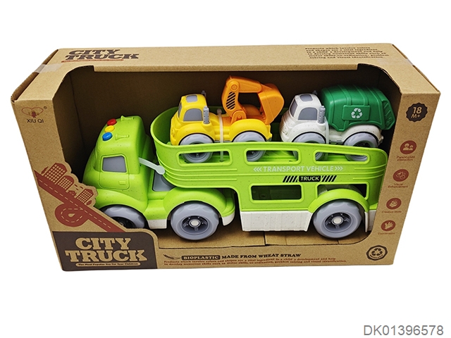Straw material sliding cartoon trailer transport vehicle (with lights and music, equipped with 2 sliding vehicles)