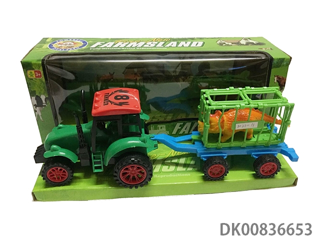 Hand held gift box container taxiing tractor with 3 dinosaurs and 2 taxiing tin racing cars and 1 plane