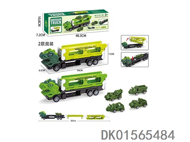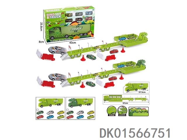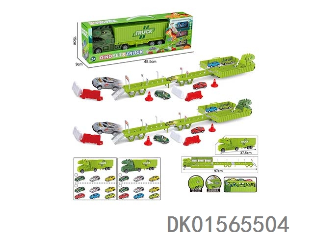 Dinosaur container truck parking scene (equipped with 3 metal powered trucks, 15 road signs and barriers, and 1 diy sticker)