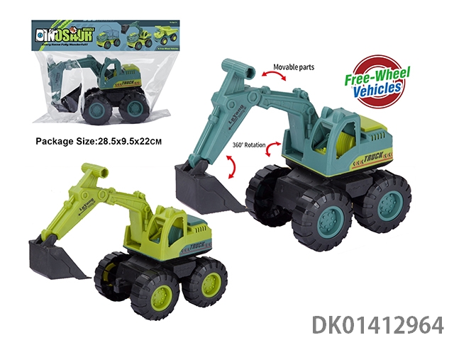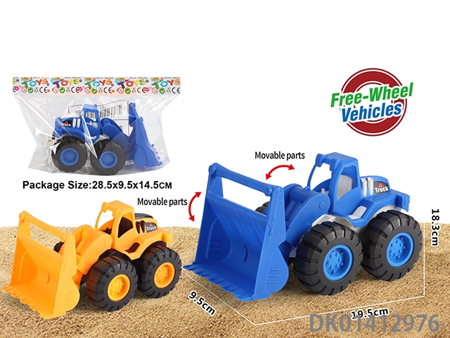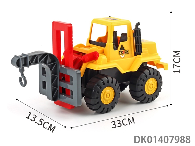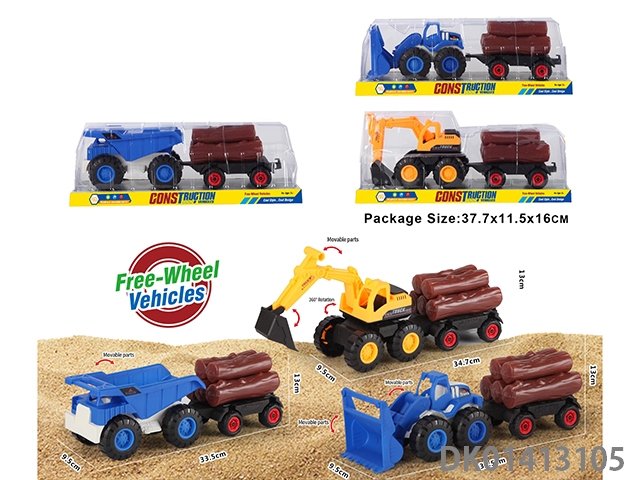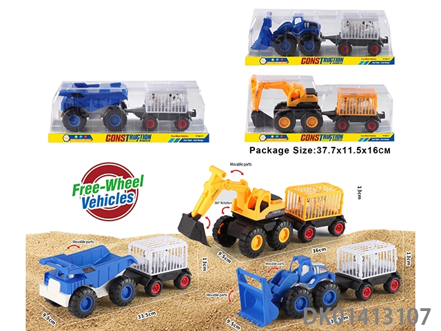 Sliding construction engineering vehicle with cow, horse, and sheep, mixed with three types of vehicles in blue and yellow