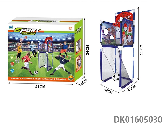 Blue ball and football, rugby and baseball stands, and sticky ball stands (5-in-1)