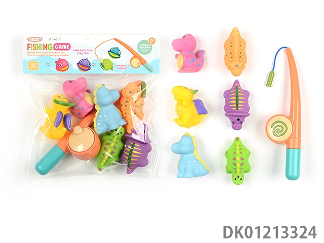 6 Bathrooms playing with plastic dinosaurs and fish rods