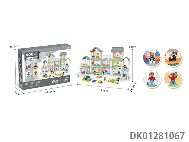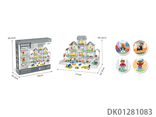 Diy villa set with building blocks/6 wooden figures/three lights