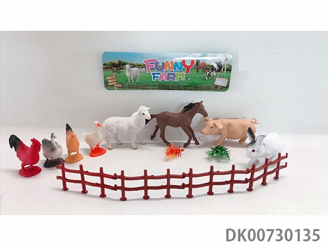 Horse, sheep, yellow pig, white rabbit, rooster, hen, goose, duck