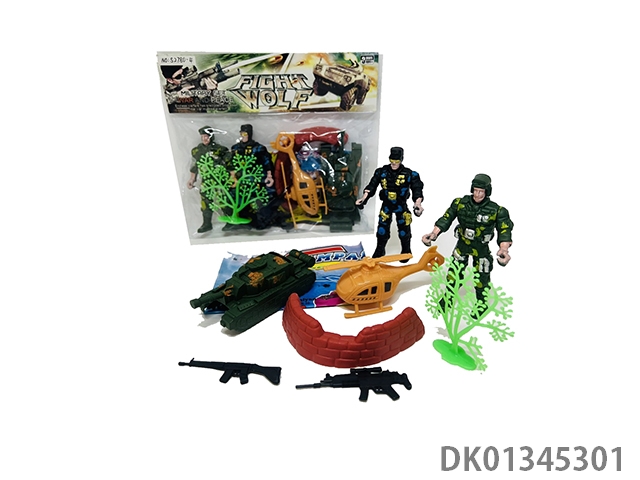 Military set (two 10.5cm tall soldiers with tanks, helicopters, sandbags, guns, trees, military maps)