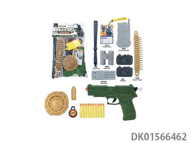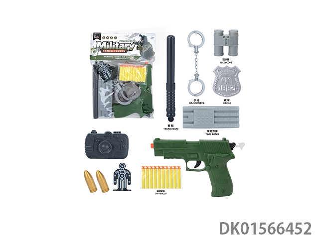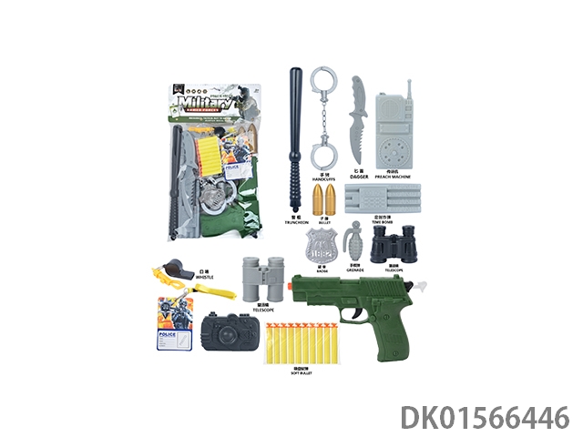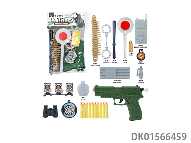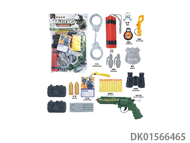 Military kit (handcuffs and bombs, compass and grenades * 2, badge and camera * 2, gold bullets * 2, hang tags and timed bombs, bullet clips and binoculars, and revolver soft ammunition gun)