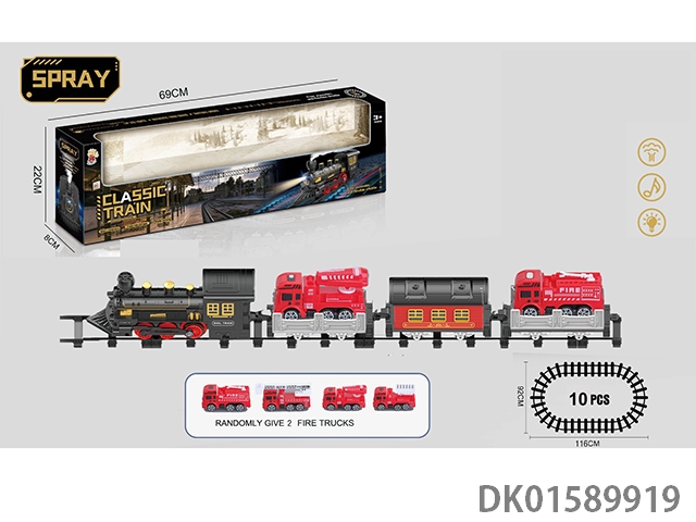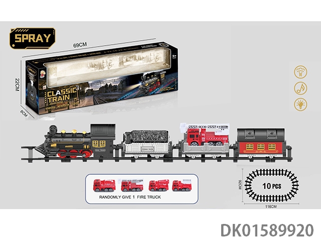 The electric rail train has spray (simulated locomotive and one cargo car, one passenger car and one carriage: one fire truck is provided with the machine), light and sound, and four No. 5 batteries without electricity