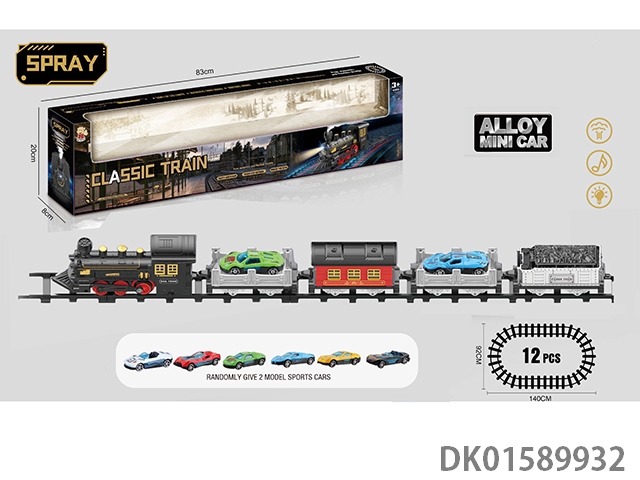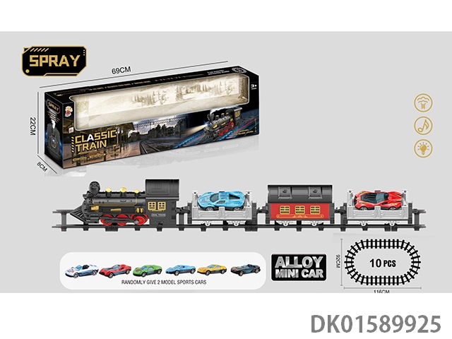 The electric rail train has spray (simulated locomotive and two trailers: two alloy sports cars are provided at random), light and sound, and four No. 5 batteries without electricity