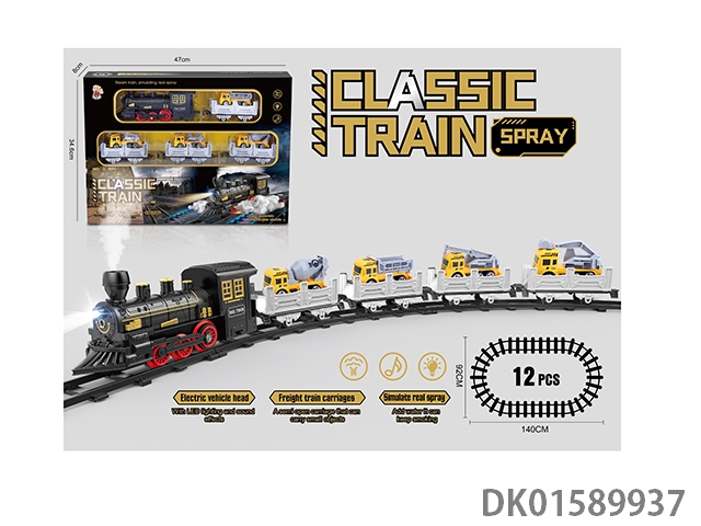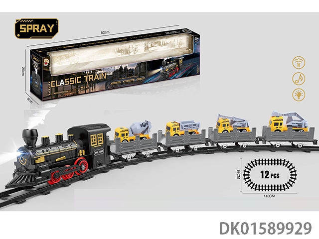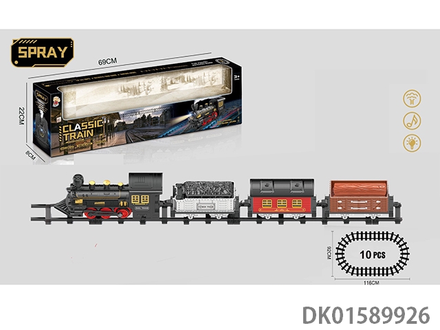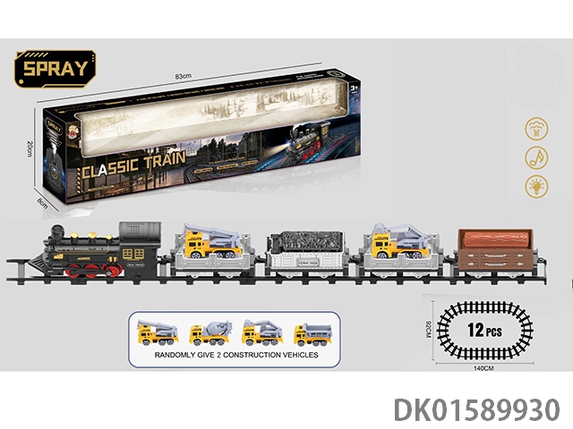 The electric rail train has spray (simulated locomotive and 1 cargo car, 1 passenger car and 1 mop: equipped with 3 cedars), light, sound, and 4 No. 5 batteries without electricity