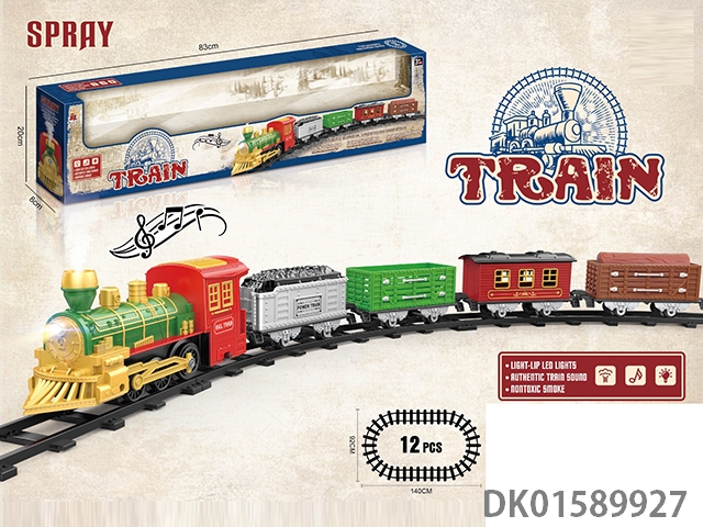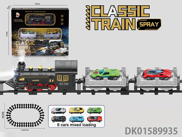 The electric rail train has spray (simulated locomotive and 1 cargo car, 1 passenger car and 1 double deck carriage: 2 alloy sports cars are provided at random), light, sound, and 4 No. 5 batteries without electricity