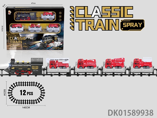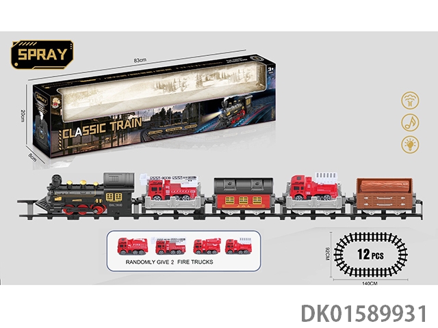 The electric rail train has spray (simulated locomotive and 2 trailers: equipped with 2 fire engines and 1 mop: equipped with 3 fir engines and 1 passenger compartment), light, sound, and 4 No. 5 batteries without electricity