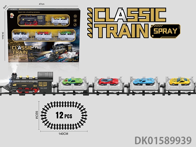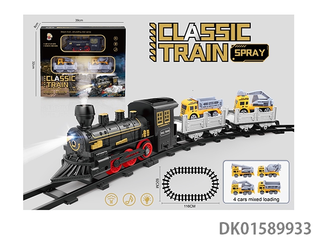 The electric rail train has spray (simulated locomotive and 2 trailers: equipped with 2 alloy sports cars, 1 cargo box and 1 passenger compartment), light, sound, and 4 No. 5 batteries without electricity