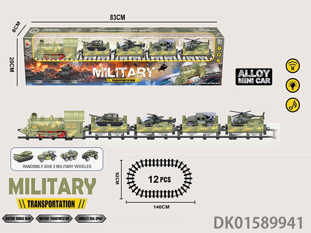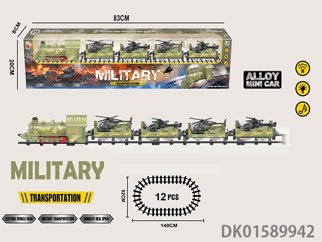 Electric military rail steam train (military locomotive and 4 trailer: equipped with 2 random alloy camouflage cars and 2 alloy camouflage planes) has lights, sound, and does not include electricity. It uses 4 No. 5 batteries